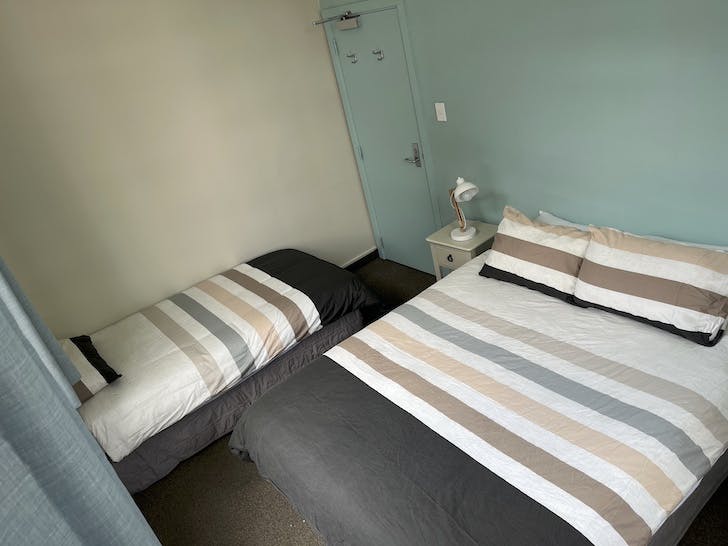 Private room with queen bed and 1 single bed. Room has armchair, heater and bedside tables with lamps. Linen and towels are supplied. Facilities are shared.