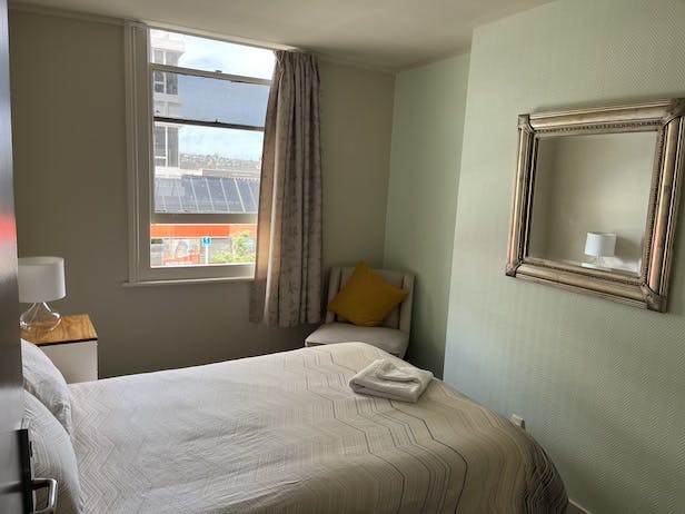 Private room with double bed. Room has armchair, heater and bedside table with lamp. Linen and towels are supplied. Facilities are shared.